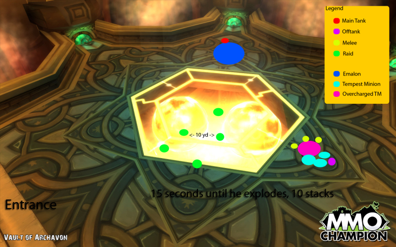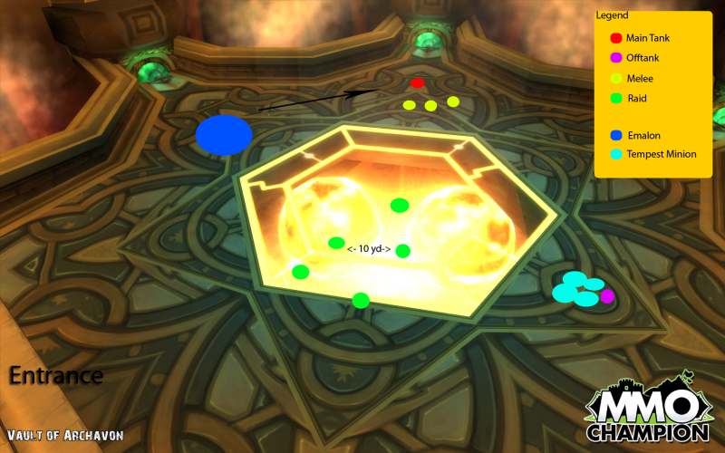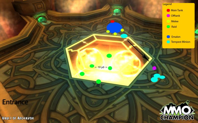 O main tank vai levar Emalon para o lado oposto, de cara pra parede e os melees vão ficar atras dele. O offtank pode se posicionar perto do meio pra facilitar que os melees se movimentem entre o boss e os Minions. A raid se posiciona no meio da sala 10 yardas de distância um do outro.